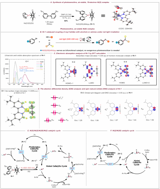 近日,化学化工学院绿色催化与合成团队薛东教授团队基于前期的研究基础,成功合成并表征了一种新型双功能、空气稳定且对光敏感的镍(0)络合物 Ni(0)(DQ)dtbbpy(dtbbpy = 4,4’-二叔丁基-2,2’-联吡啶,Ni-1)。该镍(0)络合物在空气中可稳定储存数日,具有较高稳定性(图 1A)。该镍(0)络合物Ni(0)(DQ)dtbbpy展现出了独特的光敏性,在红光(620-630 nm)照射下,可以催化芳基溴化物与醇和胺的醚化和胺化反应(图 1B)。Ni(0)(DQ)dtbbpy起着作为光催化剂和活性金属催化剂的双重作用。与传统的短波长光(如紫光、蓝光)参与反应相比,该前催化剂能在红光(更低能量和更高穿透度)照射下展示出高的催化活性,从而能抑制各种副反应产生并使反应表现出广泛的底物普适性,这突显了Ni(0)(DQ)dtbbpy作为双功能、红光敏感催化剂在合成化学中的应用潜力。在探索红光激发下Ni(0)(DQ)dtbbpy催化机制方面,通过DFT计算阐明,揭示了红光吸收的分子机制(图 1C, 1D)。基于机理研究实验和文献报道,提出了可能存在的两种镍催化循环过程(图 1E, 1F)。该工作为空气稳定镍(0)催化剂的发展提供了新的研究思路,也为红光催化在有机合成中的应用提供了参考。研究团队正进一步优化催化剂结构,探索该光敏性镍(0)前催化剂在合成化学中的进一步应用。
